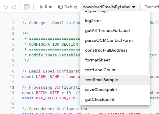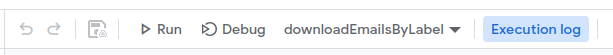 If test passes, you are ready to run the script. Select the function called downloadEmailsByLabel and click run: